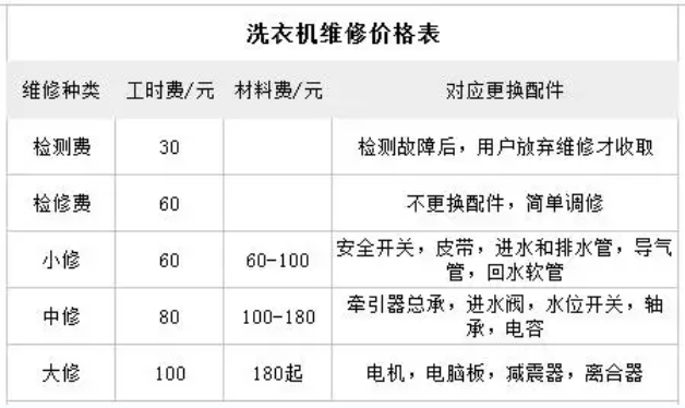 洗衣機維修的費用一般與洗衣機的規(guī)格和洗衣機的具體故障有關,而故障維修也分為小、中、大修,具體的價格可參考下表: