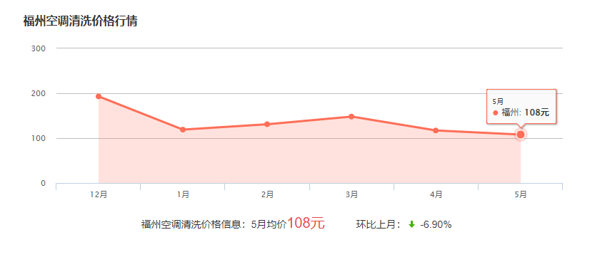 在福州清洗空調(diào)一臺的費用一般在60-300元不等,具體費用與空調(diào)的規(guī)格和類型有關(guān),下面為福州近幾個月空調(diào)清洗的價格波動圖(僅供參考):