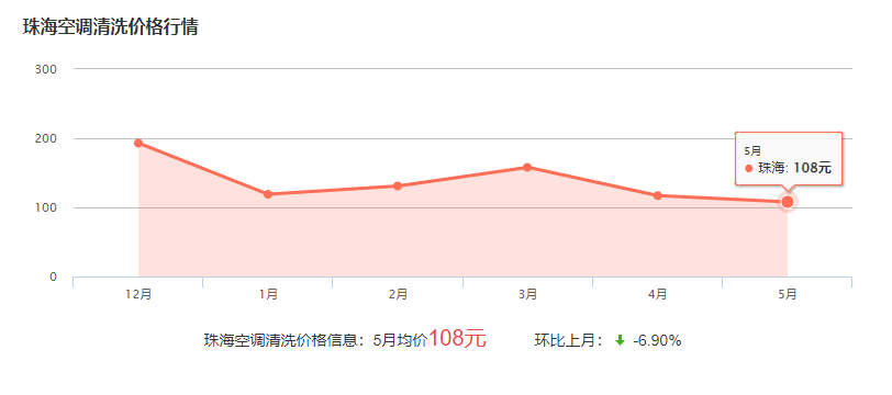 珠海清洗空調(diào)收費(fèi)標(biāo)準(zhǔn):60元起,具體費(fèi)用與空調(diào)的規(guī)格和型號(hào)有關(guān),由師傅根據(jù)實(shí)踐情況報(bào)價(jià)!下面為近幾個(gè)珠?照{(diào)清洗的費(fèi)用波動(dòng)圖,僅供參考: