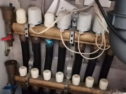 第四步,每路分水器逐一進行清洗,把地暖管從分水器上取下,用專業(yè)的地暖管清洗彈頭、用氣槍射擊彈頭,用氣泵作為動力系統(tǒng)。