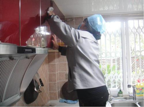 2、用強力去油劑清理櫥柜及油煙機的表面,并用毛巾擦拭廚房墻面,地磚同樣用拖把清潔;